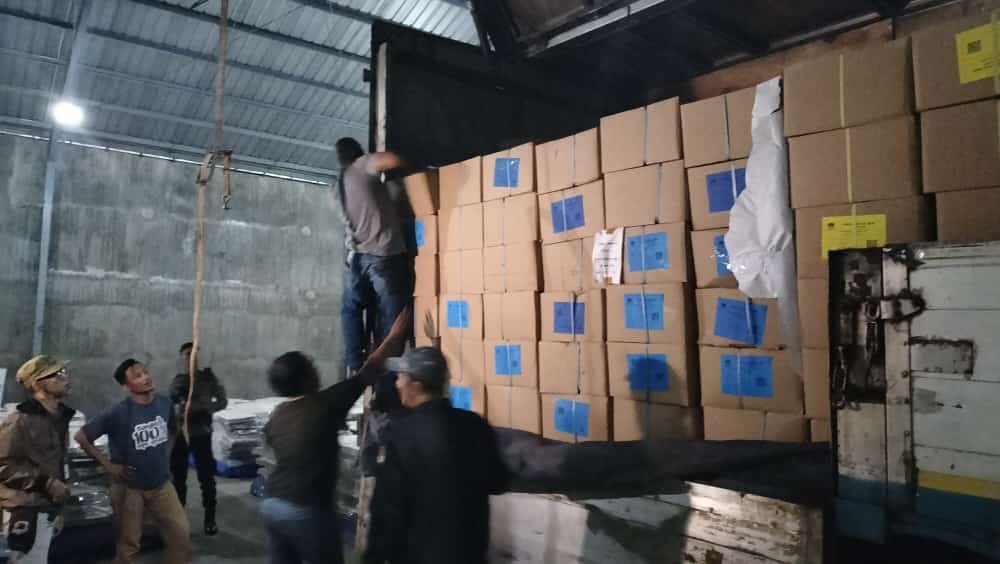 PROBOLINGGO, KPU Kota Probolinggo - Sebanyak 182.403 eksemplar surat suara untuk DPRD Provinsi Jawa Timur, tiba di gudang logistik KPU Kota Probolinggo, yang ada di Jl. Anggrek, Kelurahan Pilang, Kecamatan Kademangan, Minggu (31/12/2023) sekira pukul 23.30 WIB. Ratusan ribu surat suara itu berada dalam 365 box yang dikirim dari percetakan. Seluruh box menyertakan keterangan jenis surat suara, daerah pemilihan, dan daerah penyelenggara Pemilu berupa stiker berwarna biru. Hal itu memudahkan identifikasi masing-masing box yang dikirim. Diketahui, surat suara untuk DPRD Provinsi pada Pemilu 2024 nanti berwarna biru. Ketua KPU Kota Probolinggo Ahmad Hudri mengatakan, surat suara tersebut menjadi surat suara pertama yang diterima pihaknya. "Baru untuk DPRD Provinsi yang kami terima. Semua lengkap sesuai dengan kebutuhan yang telah ditetapkan. Yakni di masing-masing TPS dan cadangan 2,5 persen," jelasnya. Dalam distribusi tersebut, truk pengangkut dikawal ketat aparat kepolisian. Termasuk di gudang, juga dijaga oleh pihak kepolisian maupun satuan pengamanan KPU yang dikenal dengan Jagat Saksana. Gudang logistik sendiri juga dikunci yang kuncinya tidak hanya dipegang KPU, melainkan juga kepolisian. Hudri -sapaan akrabnya - mengatakan, pihaknya bersiap menerima jenis surat suara lainnya, sesuai jadwal yang dikirim percetakan. Yakni DPRD Kota Probolinggo, kemudian DPRD RI. "Lainnya tinggal menunggu. Yang pasti sudah kita terima untuk DPRD Provinsi," jelasnya. Dalam penerimaan surat suara tersebut, juga hadir Ketua Bawaslu Kota Probolinggo Johan Dwi Angga yang memantau prosesnya hingga akhir. (rdf)