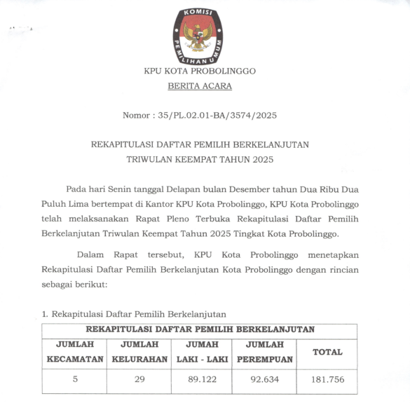 KPU Kota Probolinggo Menginformasikan Penetapan KPU Kota Probolinggo Nomor 35 Tahun 2025 Tentang Penetapan Rekapitulasi Pemutakhiran Data Pemilih Berkelanjutan Kota Probolinggo Triwulan IV Tahun 2025.
