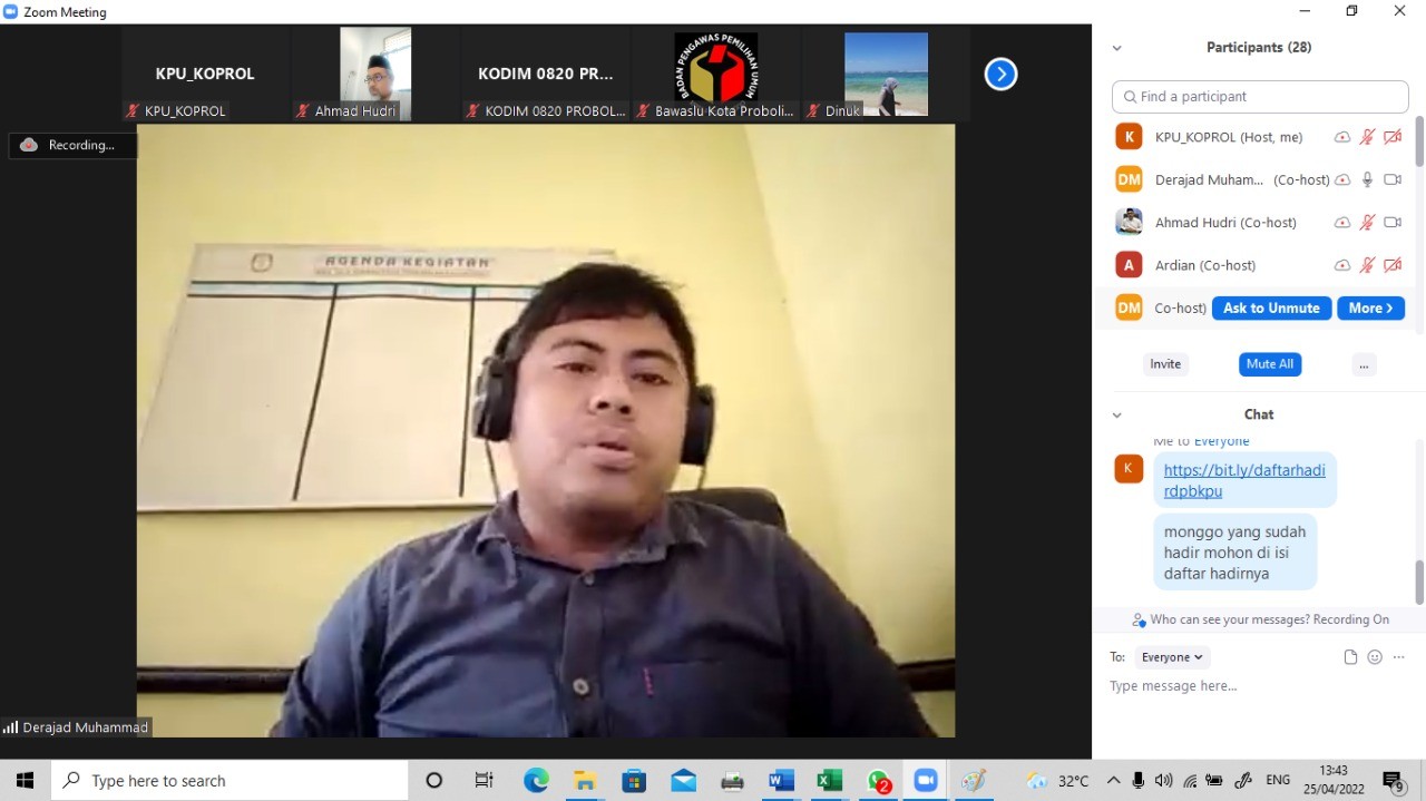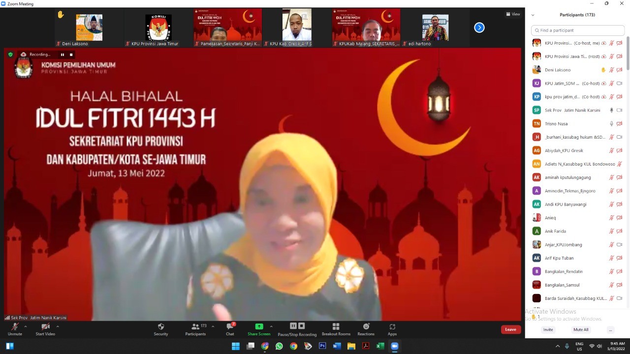 SURABAYA, KPU Kota Probolinggo - KPU Provinsi Jawa Timur menggelar halalbihalal melalui media dalam jaringan (daring), Jumat (13/5/2022). Acara yang dipandu Kabag Hukum dan SDM Rizki Indah Susanti tersebut diikuti oleh pejabat struktural dan fungsional dari Sekretariat KPU Provinsi Jawa Timur dan 38 satker KPU Kabupaten/Kota. Dalam kesempatan itu, Sekretaris KPU Provinsi Jawa Timur Nanik Karsini mengecek satu persatu 160 pejabat pengawas yang dilantik pada 11 Maret 2022 lalu. Nanik –sapaan akrabnya- berharap, agar para kasubbag segera beradaptasi dengan tugas barunya dan siap menghadapi tahapan pemilu. “Sebulan dari sekarang sudah masuk tahapan, tepatnya tanggal 14 Juni 2022. Banyak tugas besar menunggu di depan mata. Kami imbau semuanya dapat menjalankan tugas dengan baik,” tegasnya. Nanik berpesan agar para pejabat di sekretariat KPU Kabupaten/Kota untuk menjaga kekompakan dan saling mendukung. Untuk itu, perlu dijalin koordinasi dengan baik melalui berbagi media termasuk komunikasi dalam grup WhatsApp. Ia menegaskan para jajaran sekretariat tidak perlu ragu untuk saling mengingatkan dan saling belajar. Baik terkait teknis maupun administrasi. Nanik berharap pemilu dapat berjalan sukses baik secara teknis maupun administratif. “Dalam 20 bulan ke depan dipersiapkan fisik dan mental. Tetap sehat dan jaga integritas. Sukses penyelenggaraan, sukses administrasinya,” kata mantan Sekretaris KPU Kabupaten Madiun ini. Sementara itu, dalam pelaksanaan bekerja dari rumah atau Work from Home (WFH), pelayanan kantor diminta untuk tetap berjalan optimal. Setiap permintaan data dan perintah melalui grup WhatsApp agar segera dijawab dan dipenuhi. (ori/rdf)