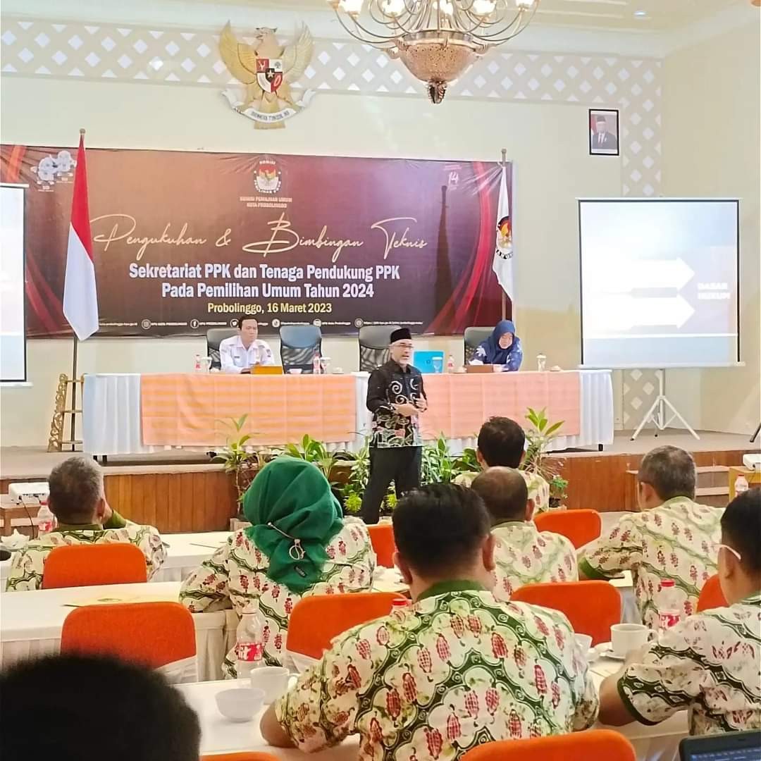 PROBOLINGGO, KPU Kota Probolinggo – Sekretariat Panitia Pemilihan Kecamatan (PPK) resmi dikukuhkan oleh KPU Kota Probolinggo, Kamis (16/3/2023). Tidak hanya sekretariat, Tenaga Pendukung PPK juga dikukuhkan dalam waktu yang sama. Dengan dikukuhkannya sekretariat dan tenaga pendukung, tugas PPK semakin terbantu. Total ada 25 orang yang dikukuhkan. Rinciannya, 15 orang sekretariat PPK dan 10 orang tenaga pendukung PPK. Untuk sekretariat PPK, di masing-masing kecamatan ada 3 orang. Yakni, satu sekretaris dan 2 staf. Sementara untuk tenaga pendukung, ada 2 orang di masing-masing kecamatan. Ketua KPU Kota Probolinggo Ahmad Hudri mengatakan, keberadaan sekretariat dan tenaga pendukung PPK merupakan amanat UU 7 Tahun 2017 tentang Pemilu. Mereka akan bertugas memberikan dukungan pada tugas-tugas PPK di semua tahapan. “Seperti halnya sekretariat, satu orang sekretaris akan mengkomando 2 staf. Satu staf bertugas di teknis p Pemilu, sosialisasi, dan hukum. Sementara satu staf lainnya bertugas di keuangan dan logistik,” jelasnya. Dalam pengukuhan tersebut, selain pengucapan sumpah janji, baik sekretariat maupun tenaga pendukung juga menandatangani pakta integritas. Hal itu sebagai peneguhan komitmen akan tugas yang diemban selama penyelenggaraan Pemilu tahun 2024. Dalam pengukuhan yang digelar di Bale Hinggil sekitar pukul 08.00 WIB tersebut, juga dihadiri Sekda Kota Probolinggo Ninik Ira Wibawati, Asisten Pemerintahan Gogol Sudjarwo, dan Ketua Bawaslu Azam Fikri. Selain itu, hadir juga Camat dan Ketua PPK se-Kota Probolinggo. (rdf)