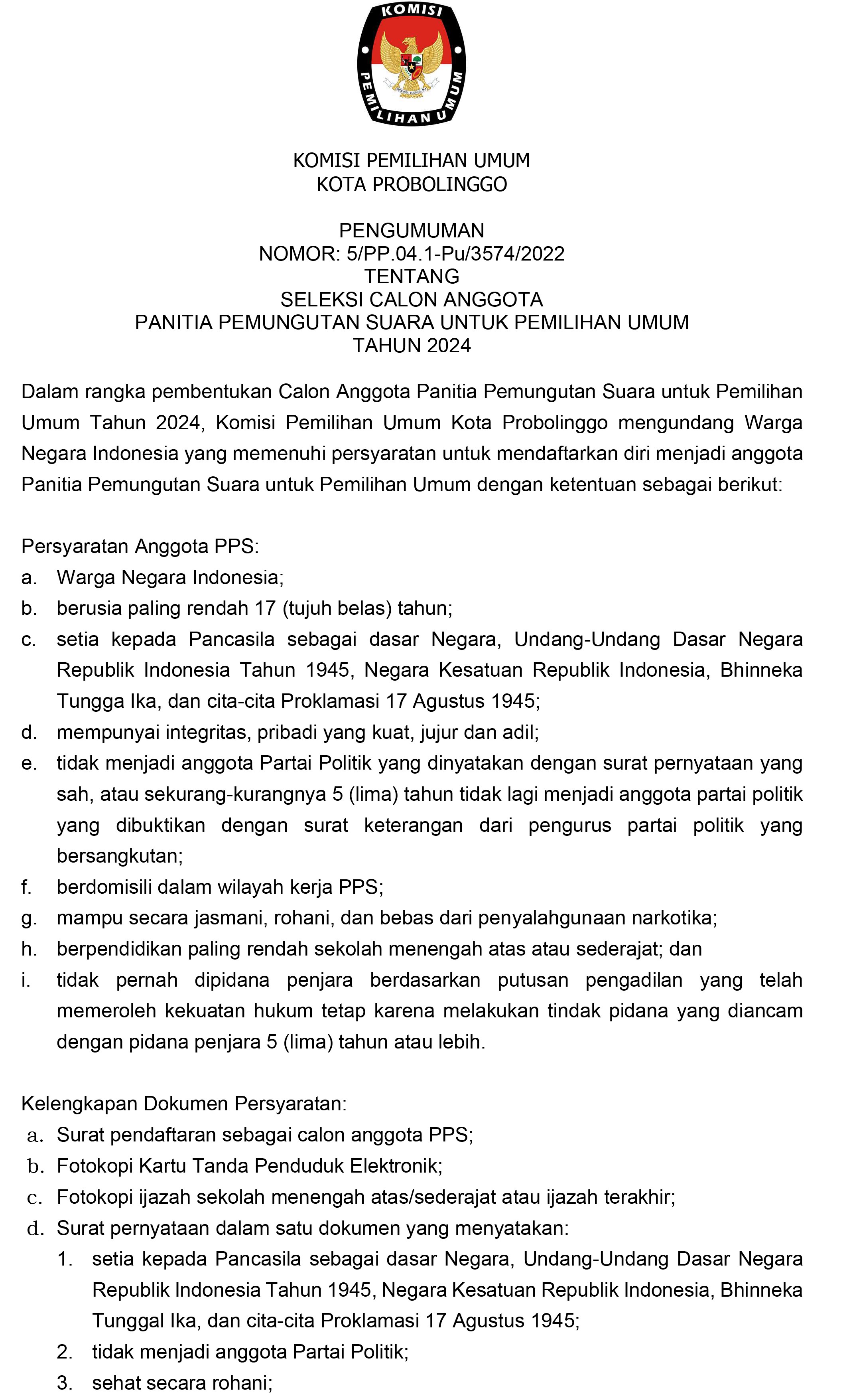 KPU Kota Probolinggo Menginformasikan Pengumuman Nomor: 5/PP.04.1-Pu/3574/2022 tentang Seleksi Calon Anggota Panitia Pemungutan Suara Untuk Pemilihan Umum Tahun 2024.