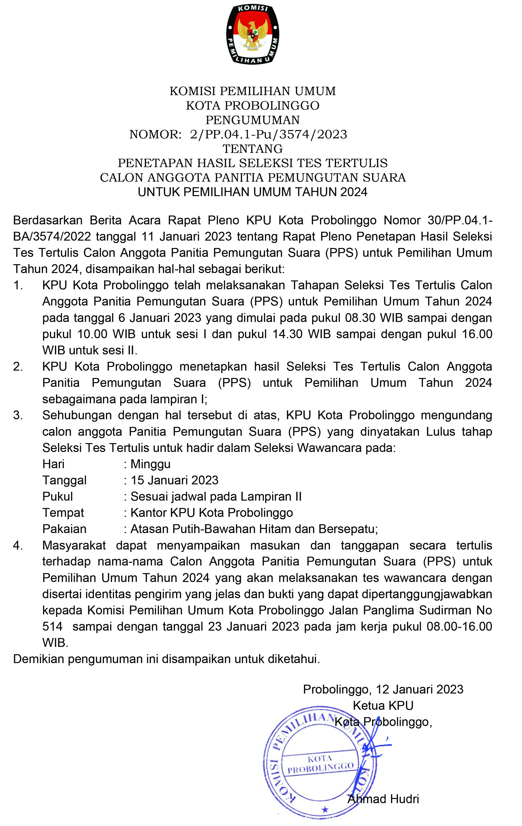 KPU Kota Probolinggo Mengeluarkan Pengumuman Nomor 2/PP.04.1-Pu/3574/2023 Tentang Penetapan Hasil Seleksi Tes Tertulis Calon Anggota Panitia Pemungutan Suara untuk Pemilihan Umum Tahun 2024