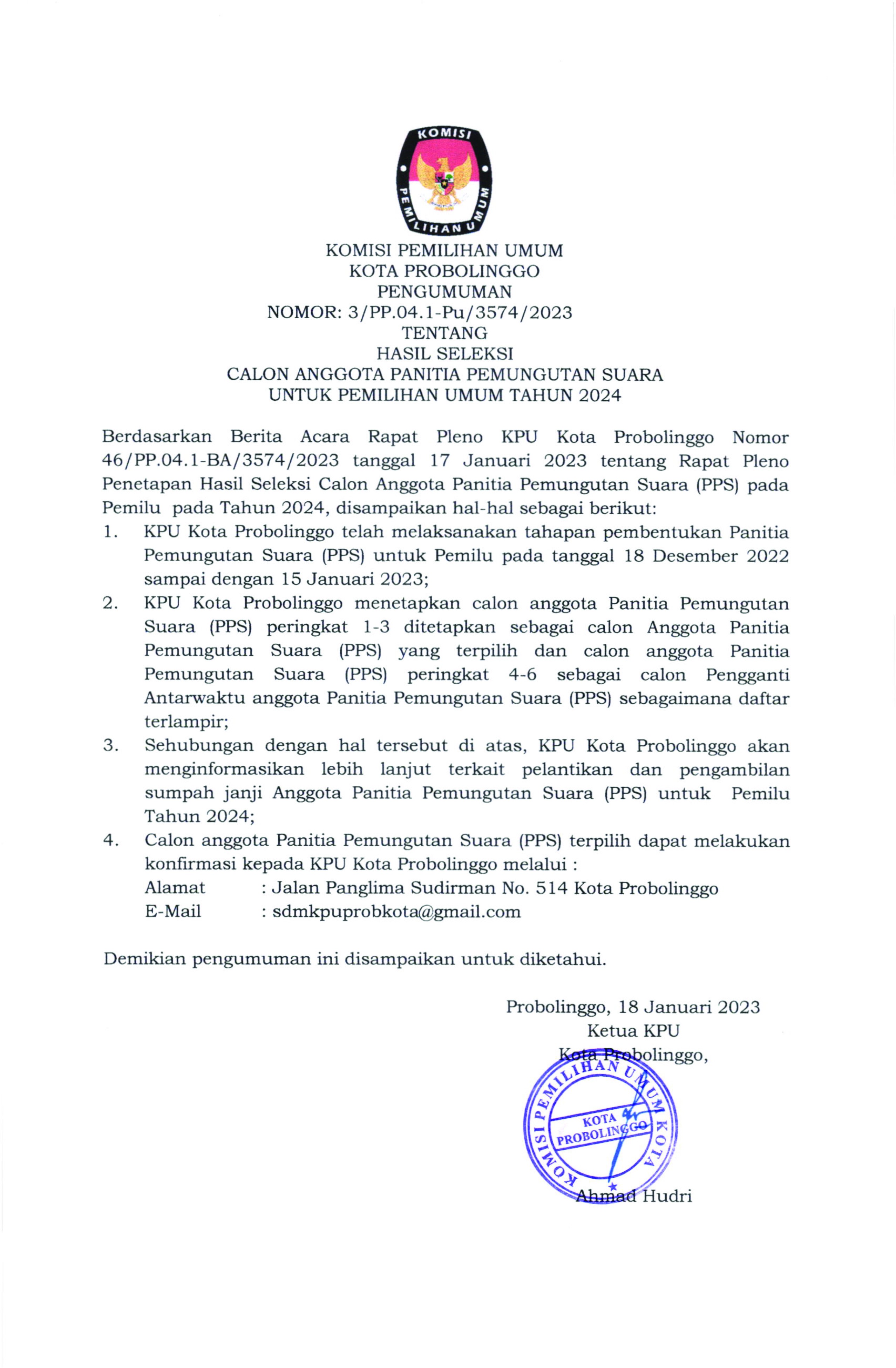 KPU Kota Probolinggo Mengeluarkan Pengumuman Nomor 3/PP.04.1-Pu/3574/2023 Tentang Hasil Seleksi Calon Anggota Panitia Pemungutan Suara untuk Pemilihan Umum Tahun 2024
