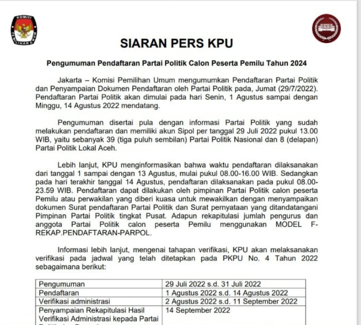 Jakarta – Komisi Pemilihan Umum mengumumkan Pendaftaran Partai Politik dan Penyampaian Dokumen Pendaftaran oleh Partai Politik pada, Jumat (29/7/2022). Pendaftaran Partai Politik akan dimulai pada hari Senin, 1 Agustus sampai dengan Minggu, 14 Agustus 2022.