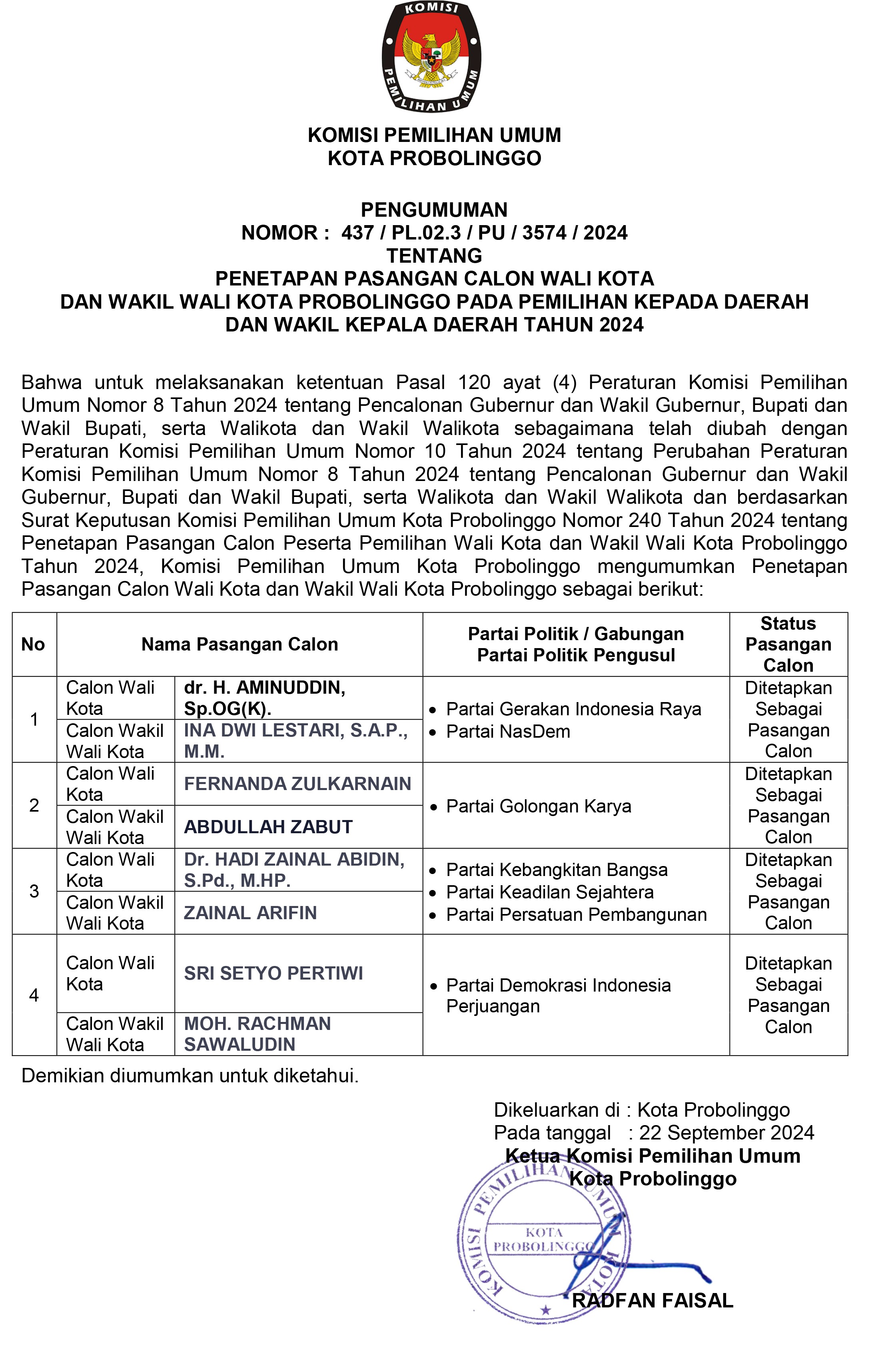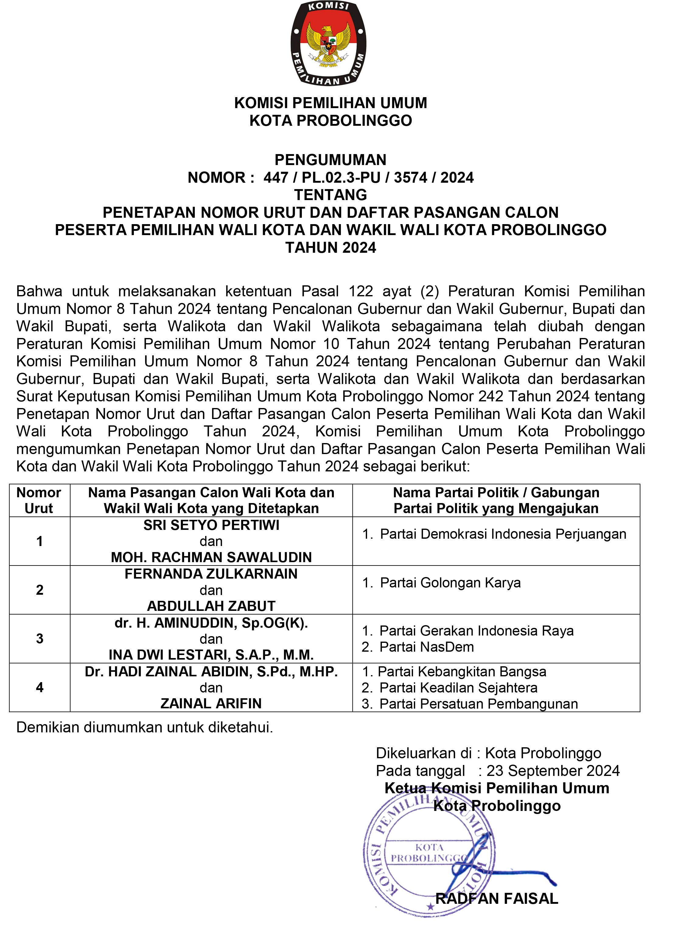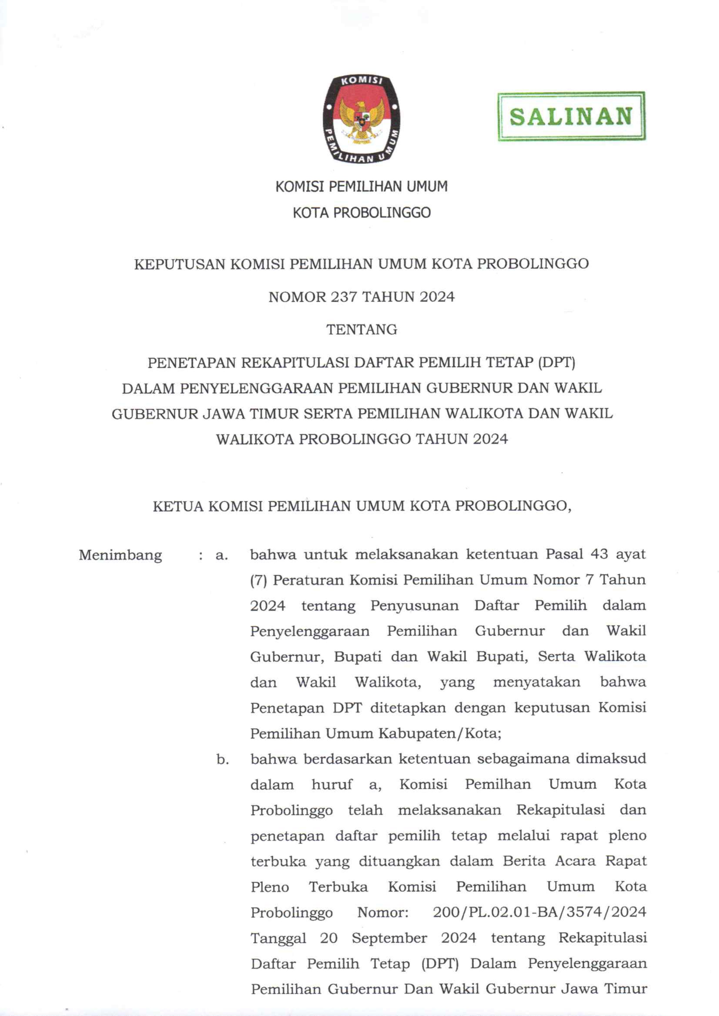 KPU Kota Probolinggo Menginformasikan Pengumuman Penetapan Rekapitulasi Daftar Pemilih Tetap (DPT) dalam Penyelenggaraan Pemilihan Gubernur dan Wakil Gubernur Jawa Timur serta Pemilihan Wali Kota dan Wakil Wali Kota Probolinggo Tahun 2024.
