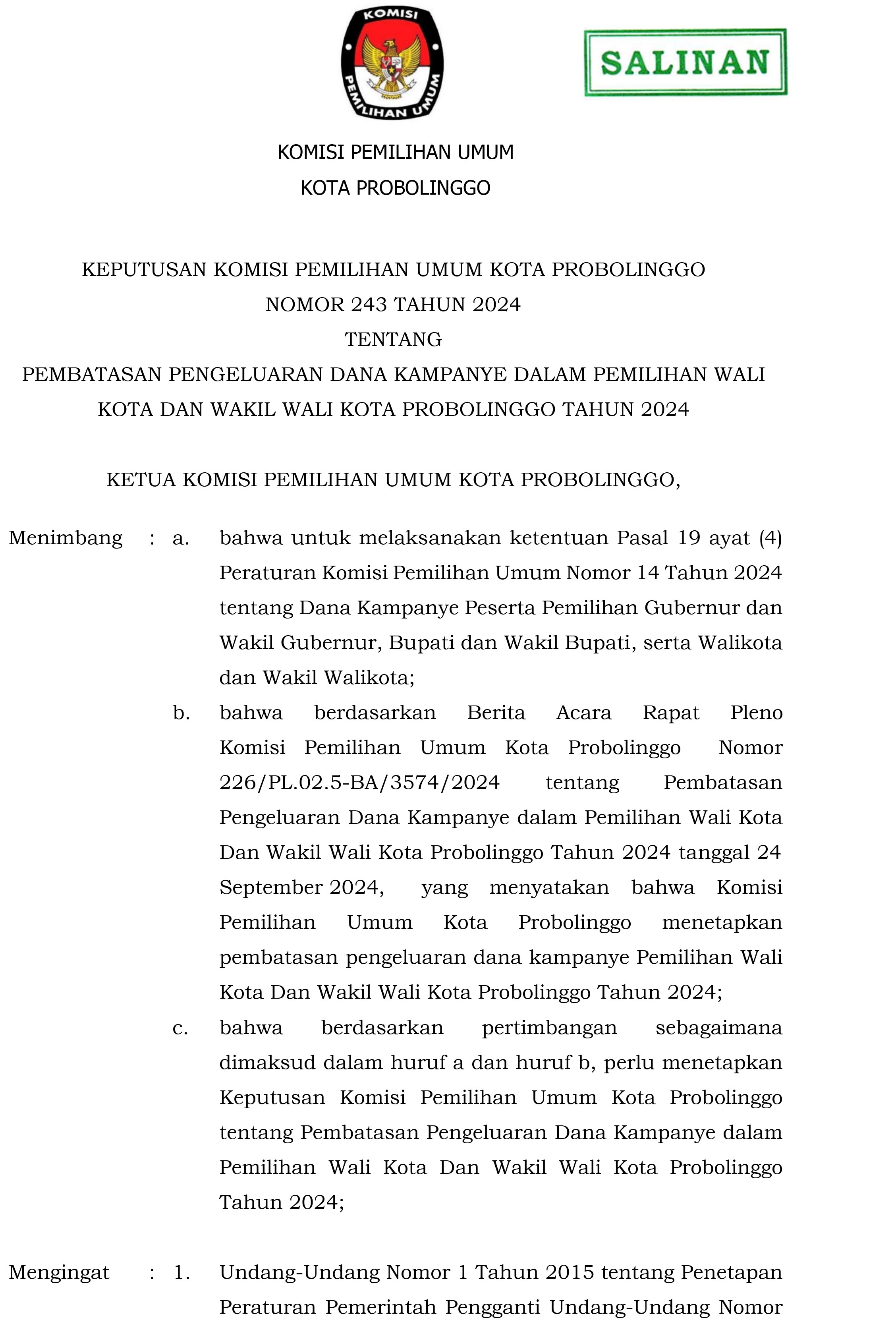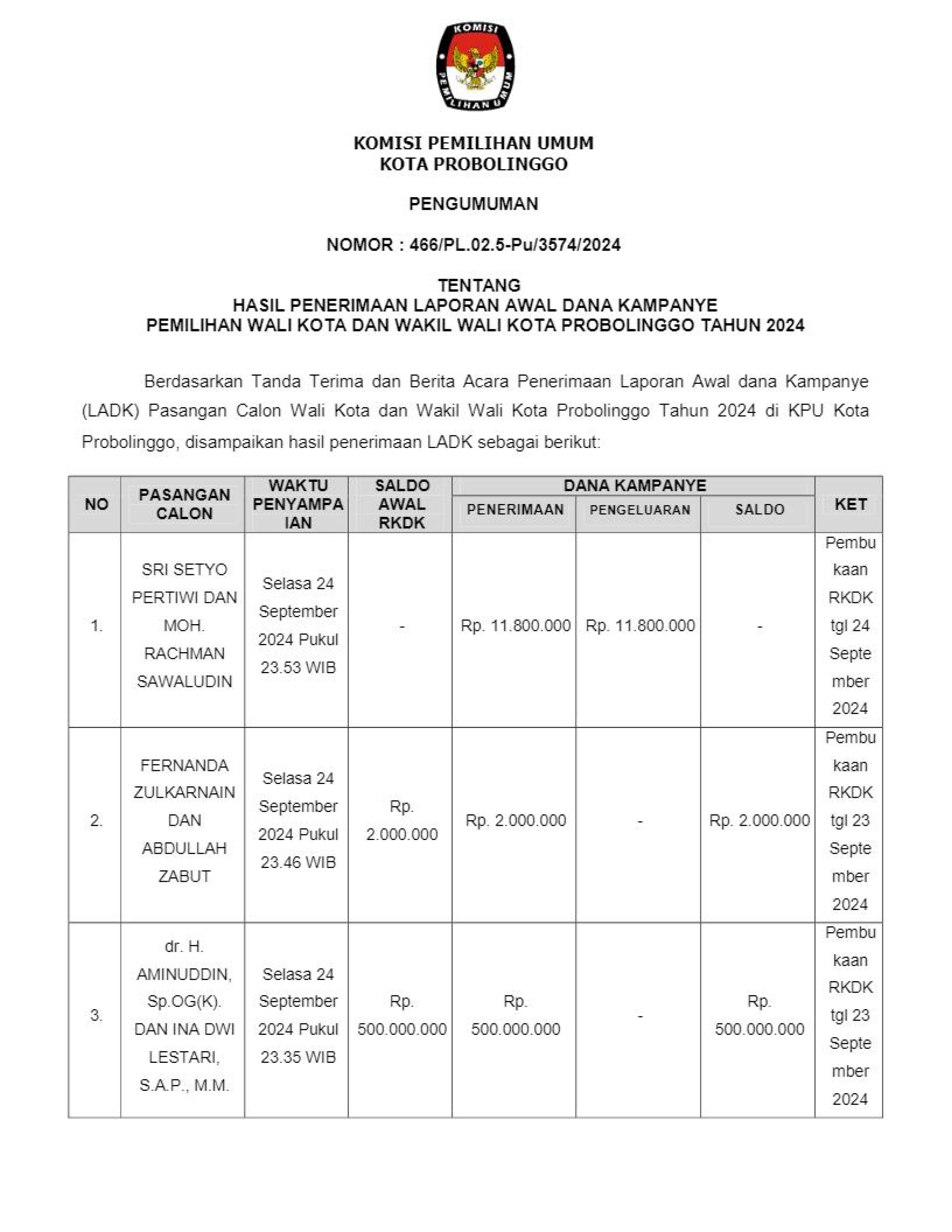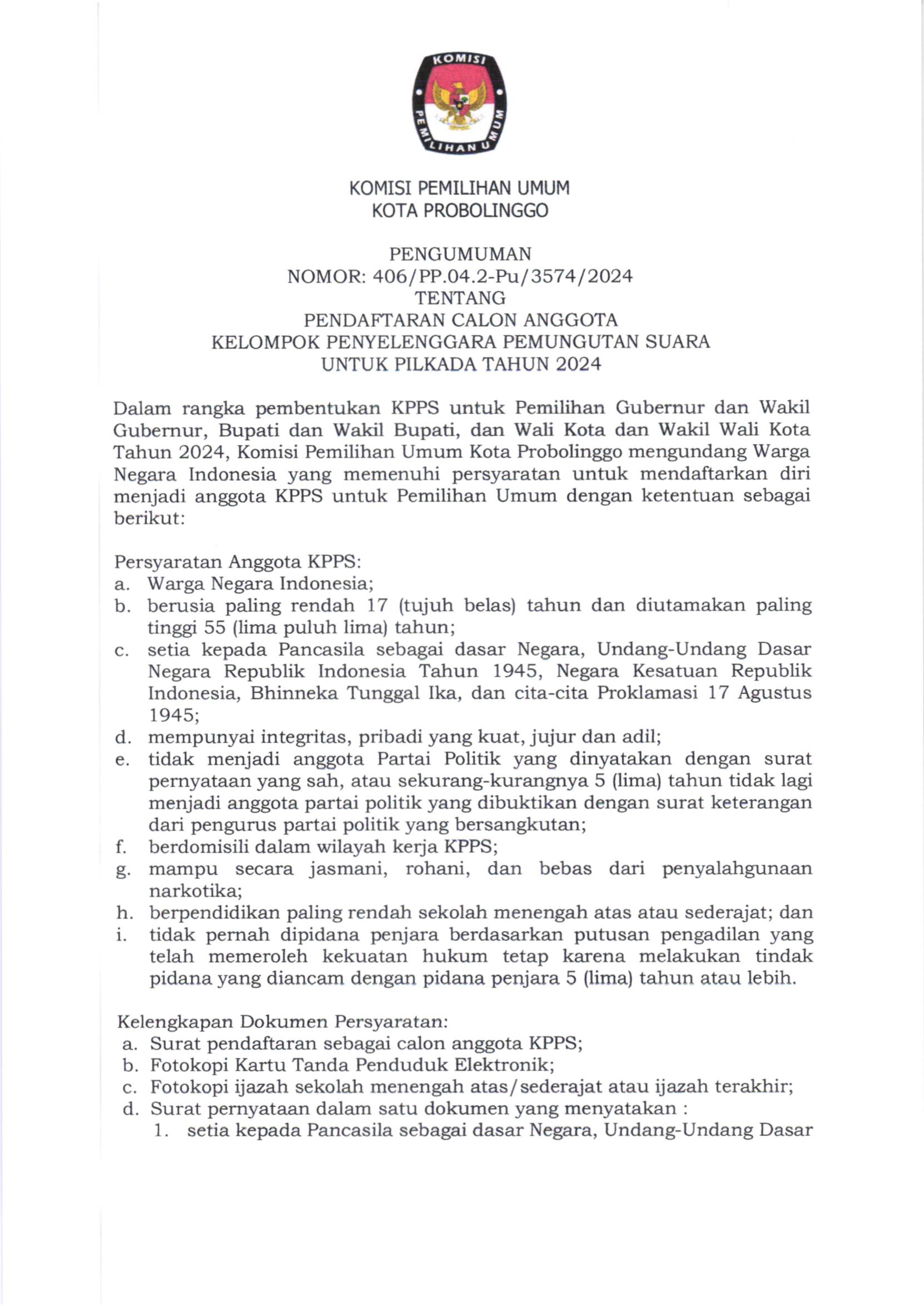 KPU Kota Probolinggo Menginformasikan Pengumuman Penetapan Rekapitulasi Daftar Pemilih Tetap (DPT) dalam Penyelenggaraan Pemilihan Gubernur dan Wakil Gubernur Jawa Timur serta Pemilihan Wali Kota dan Wakil Wali Kota Probolinggo Tahun 2024.