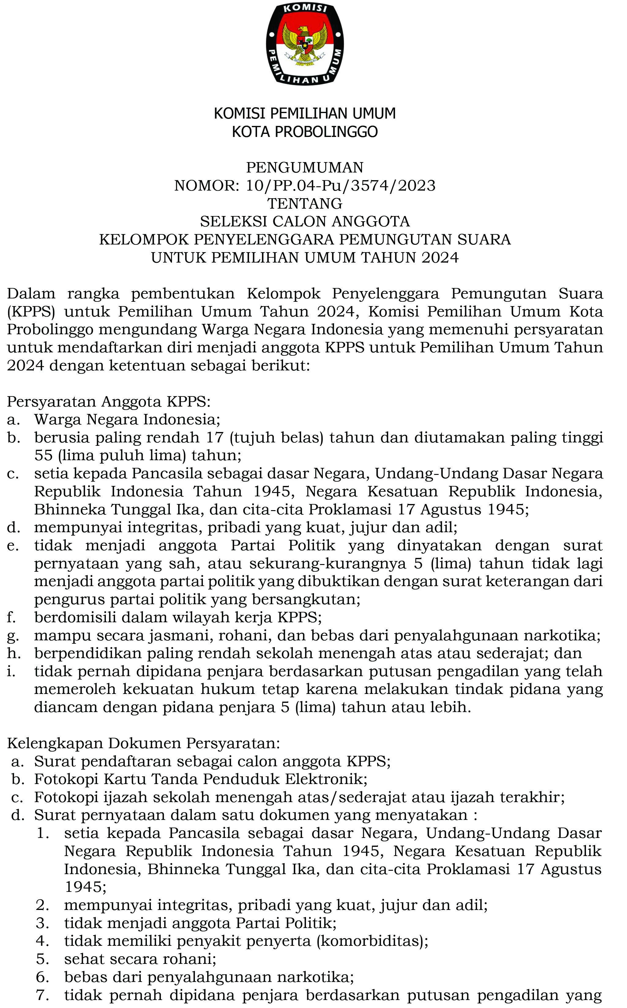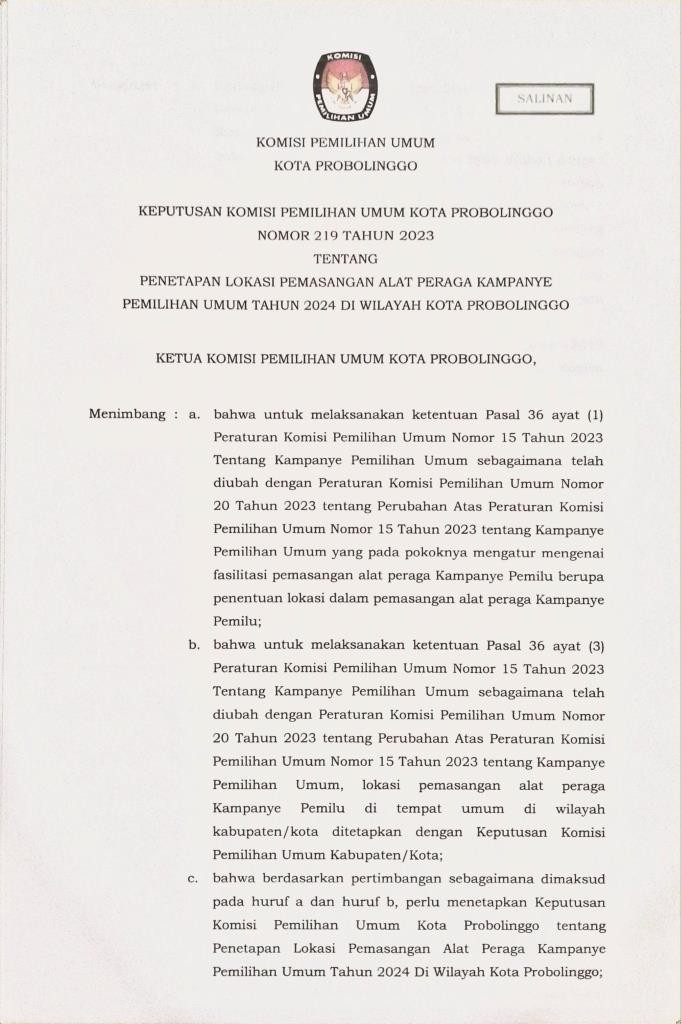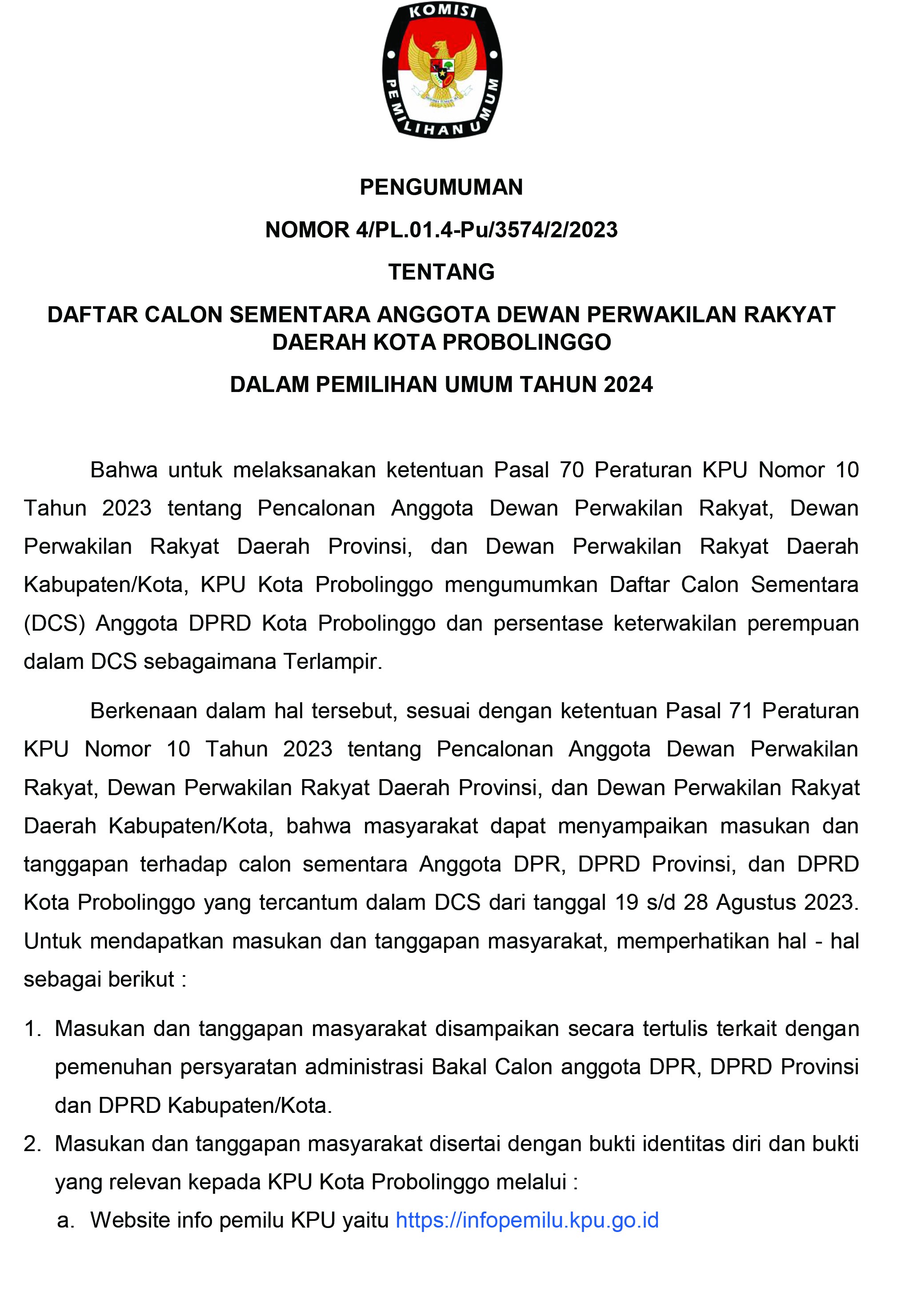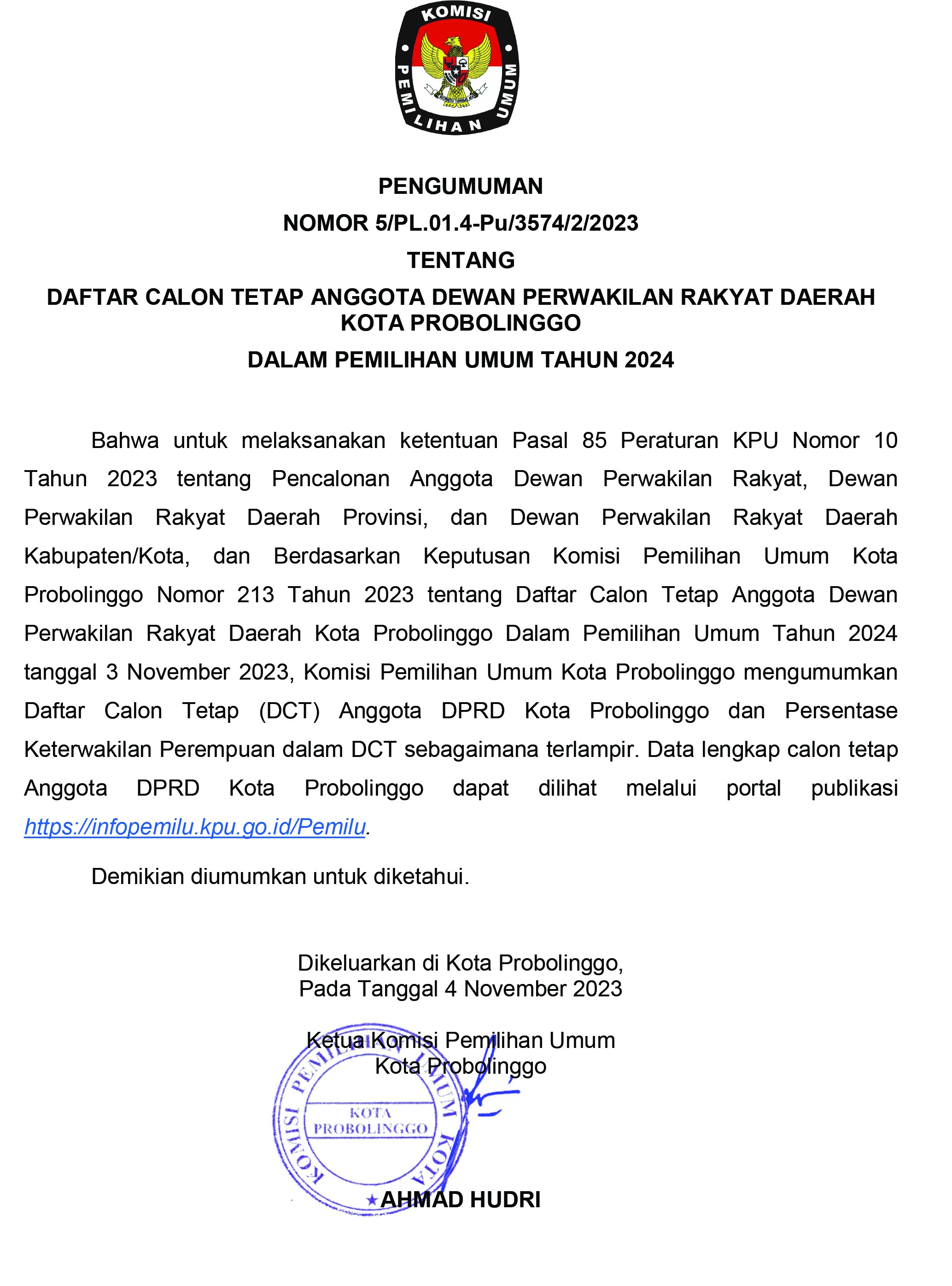 KPU Kota Probolinggo Mengeluarkan Pengumuman Nomor 5/PL.01.4-Pu/3574/2/2023 Tentang Daftar Calon Tetap Anggota Dewan Perwakilan Rakyat Daerah Kota Probolinggo Dalam Pemilihan Umum Tahun 2024.